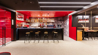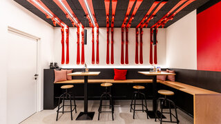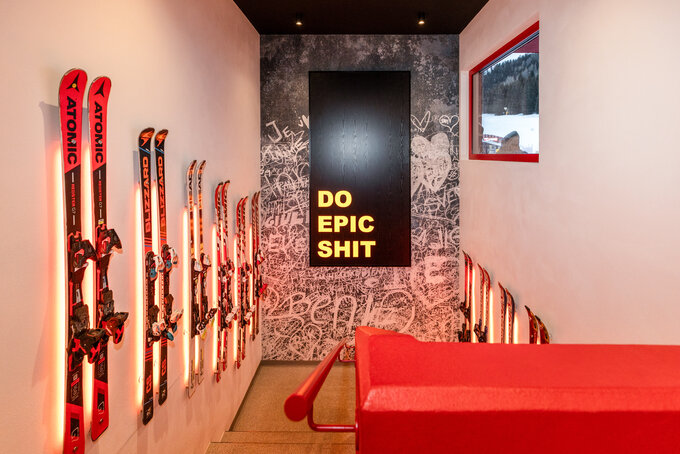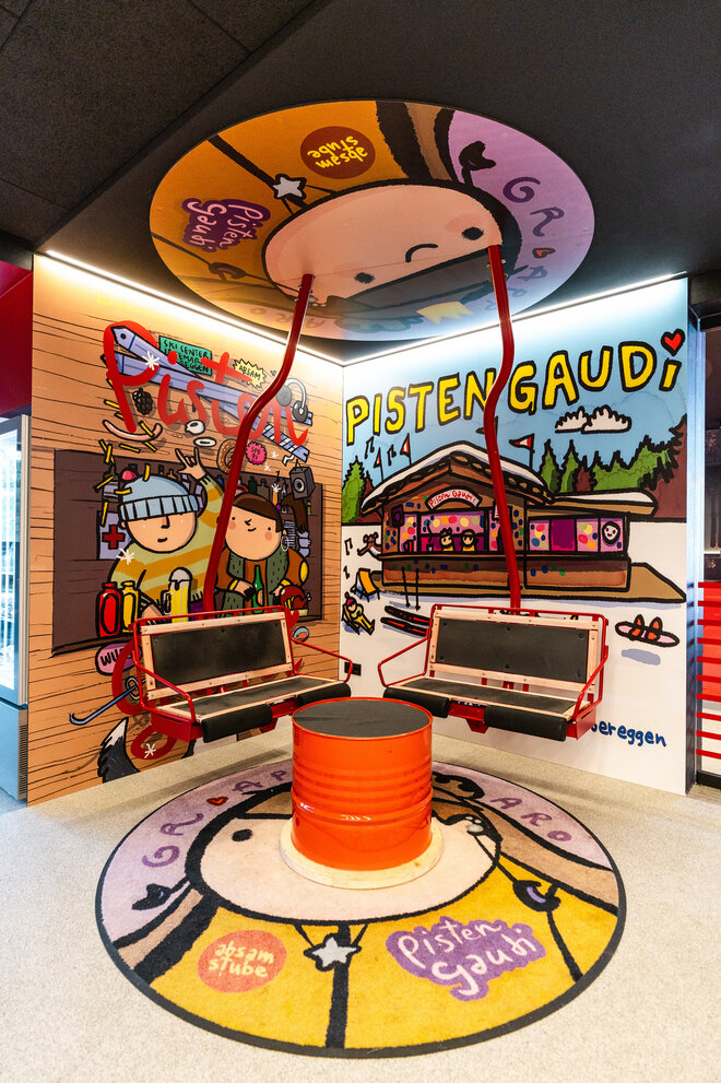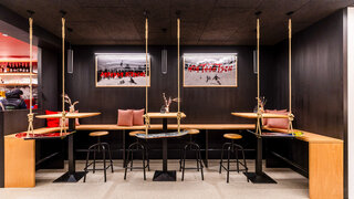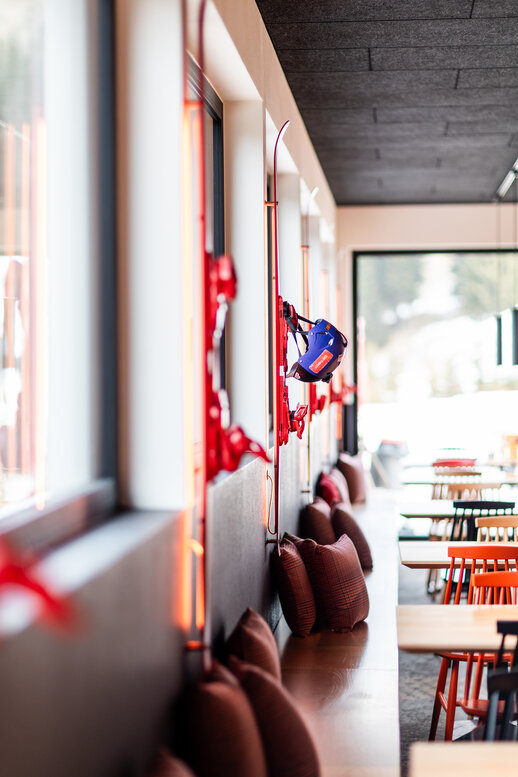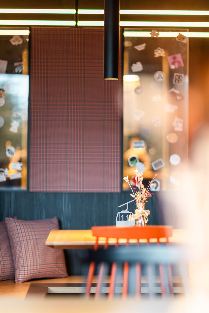 Die Absam Stube ist eine Skihütte, in der alpine Tradition und freche Moderne aufeinandertreffen: Schwarz gebeiztes Holz, grafische Karomuster und kräftiges Rot inszenieren die klassische Hütte neu. Innen sorgen bunte Farben, Snowboardschaukeln, Ski an den Wänden, Stickerwände und humorvolle Sprüche für ein verspieltes, zeitgemäßes Alpengefühl – und machen das Design interaktiv, weil Gäste eigene Sticker hinterlassen und so die Geschichte der Hütte mitschreiben können. So wird die Absam Stube zu einem Ort, der den Skitag verlängert, die Sinne kitzelt und mit jeder Geschichte ein Lächeln provoziert.