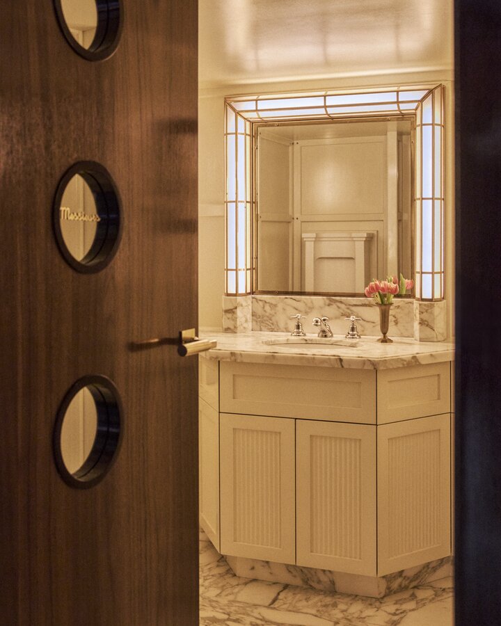 Das Restaurant zeichnet sich architektonisch durch die Verbindung klassischer Mailänder Gestaltung mit einem modernen, urbanen Kontext aus. Der Innenraum greift Stilmerkmale der 1930er-Jahre auf: lackierte Holzoberflächen, Messingdetails, Marmor sowie eine zurückhaltende Farbpalette mit Grau- und Gelbtönen. Diese Elemente erzeugen eine elegante, zeitlose Atmosphäre mit starkem Bezug zur norditalienischen Designtradition. Die Raumstruktur ist klar gegliedert: Im Eingangsbereich befindet sich ein offener Bar- und Patisseriebereich, während der hintere Teil als ruhiger, gedimmter Gastraum mit Teppichen und dichter Möblierung ausgebildet ist. Künstlerische Elemente wie Skulpturen, Grafiken und großformatige Glasreliefs sind bewusst in den Raum integriert und schaffen visuelle Akzente. Gleichzeitig wird durch die Materialwahl und Detailausbildung ein hochwertiger, fast clubartiger Charakter erzeugt, der sowohl Intimität als auch Exklusivität vermittelt.